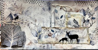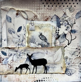 Welcome 2023! I am hopeful that this year will be better than 2022. It has to be! Fun stuff ahead and it begins with the January journal page. It is called ‘A Winter’s Day’ and features gorgeous digital papers from Luise Heinzl (used with permission) and the little journaling card has an image from Andrea Allan (used with permission). Fussy cutting, collaging, a bit of tissue, a napkin and some die cuts finish off the layered page.